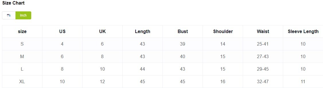 | Size | US | UK | Length | Bust | Shoulder | Waist | Sleeve Length |
